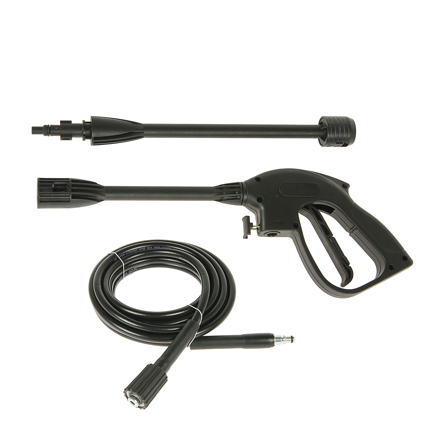 Мойка высокого давления, пистолет-распылитель, удлинитель пистолета с соплом, гибкий шланг высокого давления, емкость для моющих средств, переходник, игла для очистки сопла
