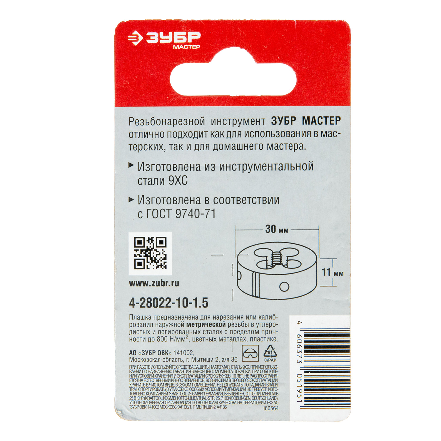 Плашка М10x1.5мм сталь 9ХС (4-28022-10-1.5) ЗУБР *1/10/60