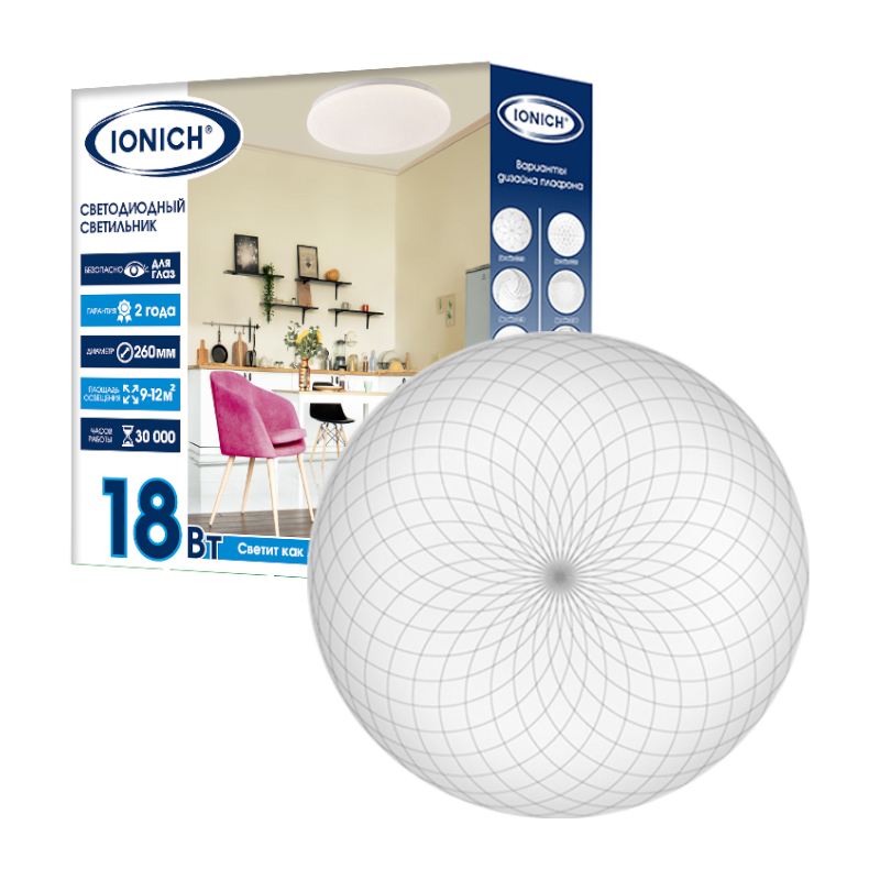 Светильник светодиодный акриловый 260мм IONICH "Кассиопея"18Вт 6500К 1260Лм IP20 белый S=9-12м2 1107*1/40