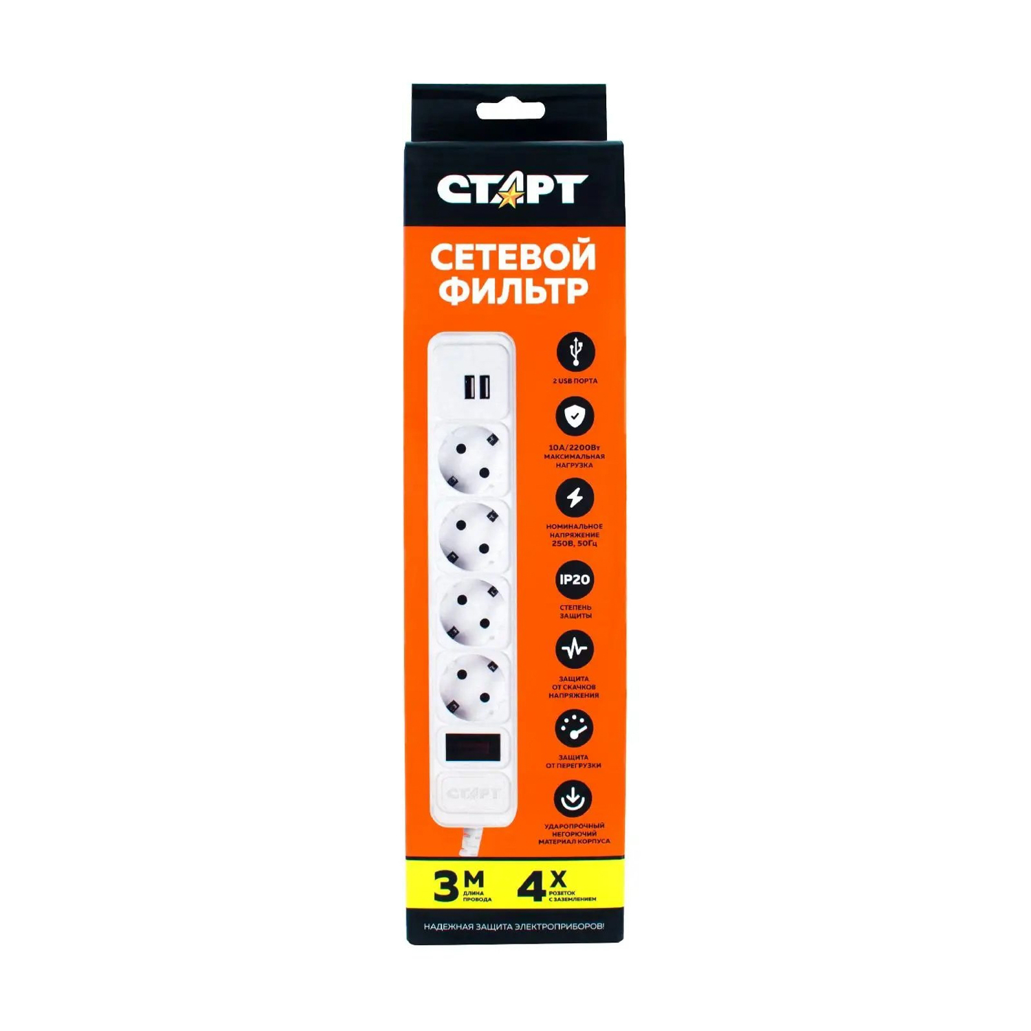 Сетевой фильтр 4 розеток 3м 2USB 10А ПВС 3x1 нагрузка 2200Вт белый Старт ZVT *1/20