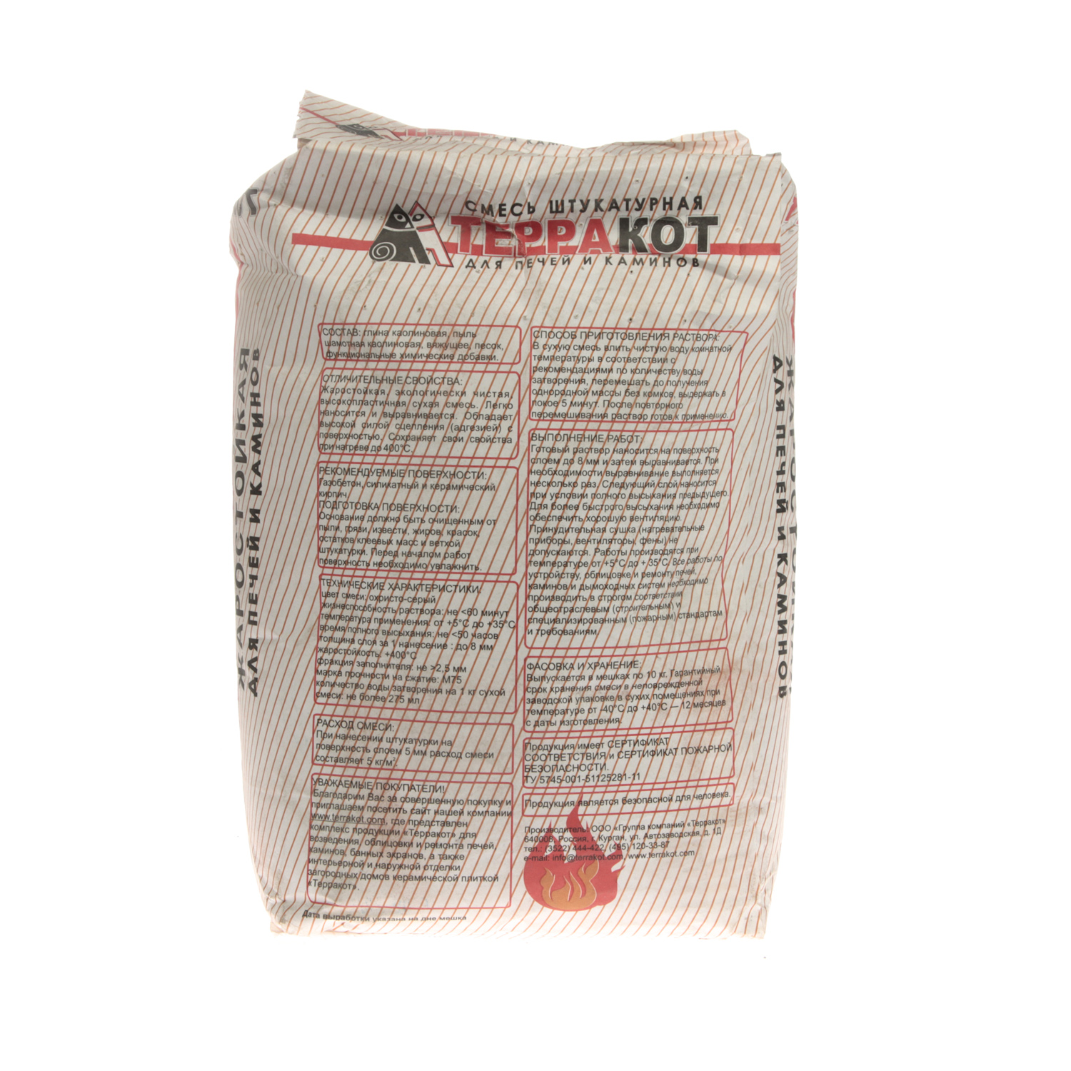 Штукатурка жаростойкая Терракот — экологически чистая, высокопластичная сухая смесь. Легко наносится и выравнивается. Обладает высокой силой сцепления (адгезией) с поверхностью. Сохраняет свои свойства при нагреве до 400 °С. Марка прочности на сжатие: М75.
