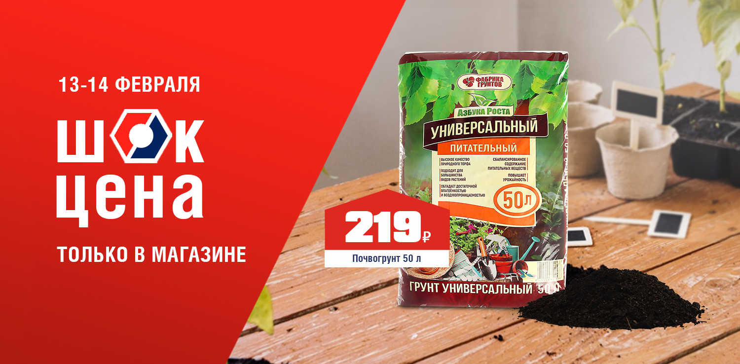 Устали от слабой рассады и поиска идеального грунта для каждой культуры? Универсальный почвогрунт — это ваше готовое решение! Сбалансированный состав и оптимальная кислотность создают идеальную основу для томатов, огурцов, перцев и цветов. Он обеспечивает здоровый старт растениям, избавляя вас от лишних хлопот и гарантируя отличный результат. 13 и 14 февраля в розничных магазинах ДомоСтрой не пропустите ШОК-цену: